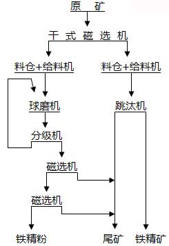 由上图可以看出,该褐铁矿单体解离较高,几乎不需要破碎,经过洗选和跳汰即可获得良好的选矿指标。其中黄色的杂石即为废石,黑褐色为褐铁矿和磁铁矿,该矿为磁褐共生矿,粒度不超过5mm,巩义市佛瑞机械厂为其设计的选矿工艺流程为磁选-跳汰机-脱水。下图为具体工艺流程图: