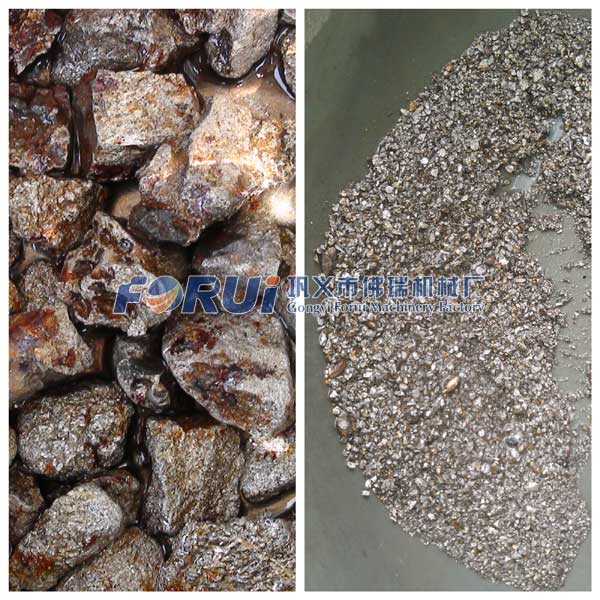 回收铬渣里的渣铁,其实就是从铬铁冶炼渣里选铬铁合金,业内也有人称之为洗渣铁,回收铬渣里的渣铁用的是一种重力选矿的方法,根据渣铁和铬渣之间的比重差进行的一种分选作业,据了解渣铁比重7.2,铬渣比重3.2,两者之间比重悬殊,通过破碎可以使嵌布在铬渣里的渣铁与铬渣彻底解离,然后就满足重力分选的全部条件了,所以重力分选的方法可以从铬渣里回收渣铁。也许有人回收那为什么不用磁选法回收渣铁呢?既然是渣铁肯定是有磁性的呀,用磁选法回收的效率和效果会不会更好呢?其实这个问题我们早就讲过了,因此铬渣也具有磁性,当我们尝试用磁选法回收铬渣里的渣铁时得到的结果是铬渣和渣铁同时被吸附了,导致起不到任何的回收效果,因此磁选法在回收铬渣里的渣铁这个领域是无效的,它不能用来回收铬渣里的渣铁。下面是我们用磁铁吸附破碎后的铬渣的照片和我们用跳汰机重选法回收铬渣里的渣铁的视频: